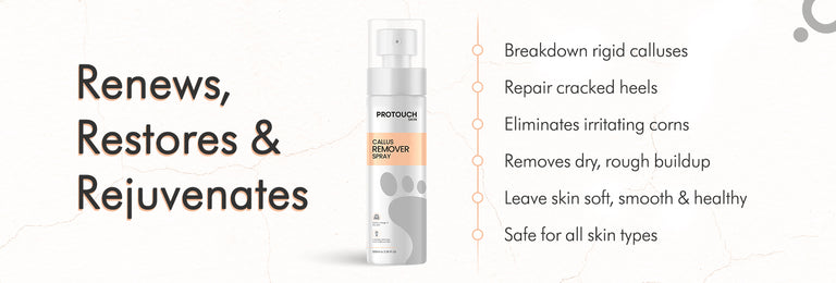 The Protouch Callus Remover Spray is a fast-acting solution designed to soften and break down hard, rough skin and calluses on the feet. It works by loosening dead skin cells, making it easier to exfoliate and remove calluses.